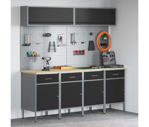 Šis rūpnieciskais darba skapis ir lieliska izvēle, lai turētu jūsu rīkus kārtībā. Ar stilīgu melnu un pelēku apdari, tas ir ideāls garāžām vai darbnīcām. Tas piedāvā daudz glabāšanas iespēju, vienlaikus saglabājot rīkus ērti pieejamus.