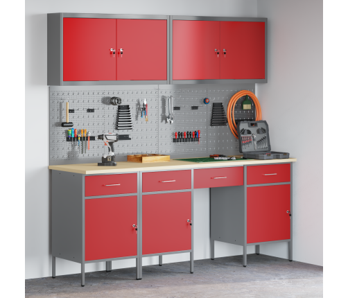 Šis rūpnieciskais darbnīcas skapis apvieno stilu un funkcionalitāti ikvienai garāžai vai darbnīcai. Ar spilgti sarkanu un pelēku dizainu, tas apvieno stipru tērauda rāmi ar koka tekstūru inženierijas koka virsotnē, radot profesionālu darba vietu, kas piemērota gan pieredzējušiem tirgotājiem, gan DIY entuziastiem.