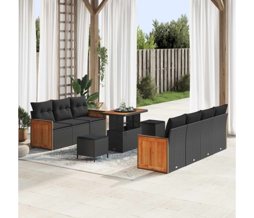 Šis dārza dīvānu komplekts apvieno stilu un funkcionalitāti, paredzēts pulcēšanās reizei līdz sešiem. Ar savu melno poli rotangpalma rāmi un izturīgām dabīgā koka virsotnēm, tas rada elegantu atmosfēru āra vidē, kas ir lieliski piemērota terasēm, balkonam vai dārziem.