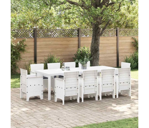 Izgatavots no izturīgas polietilēna rotangpalmas ar gludu baltu apdari, šis dārza ēdamistabu komplekts piedāvā plašu taisnstūra galdu un desmit ērti krēslus. Tas ir ideāls āra maltītēm, piešķirot eleganci jūsu balkonam vai terasei, vienlaikus ērti uzņemot lielākas grupas.