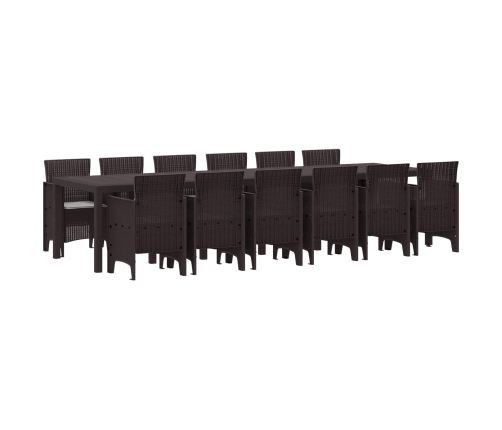 Šis 13 daļīgais dārza ēdamistabas komplekts ir ideāli piemērots āra maltītēm, apvienojot stilu ar praktiskumu. Brūnā polietilēna rotangpalmas konstrukcija ne tikai ir izturīga, bet arī sniedz mūsdienīgu sajūtu, kas piešķir dzīvību jebkuram iekšpagalmam, dārzam vai balkonam, padarot to par lielisku izvēli ģimenēm vai draugu sapulcēm.