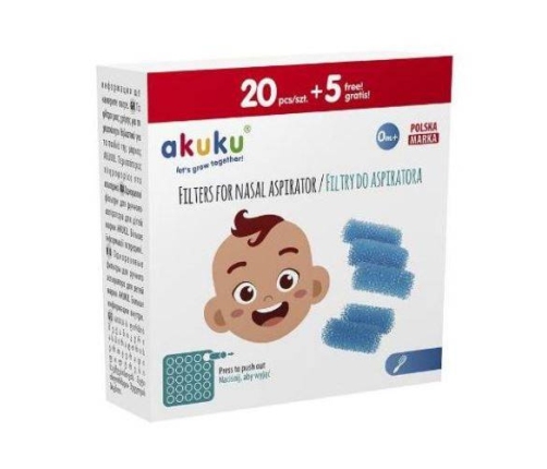 Filtry do aspiratora marki Akuku to części, które podczas czyszczenia nosa, zabezpieczają wydzielinę przed wypłynięciem do ustnika. Niwelują prawdopodobieństwo zarażenia się osoby czyszczącej nosek dziecku i zapewniają odpowiednią higienę. Po każdym użyciu aspiratora należy wymienić filtr.