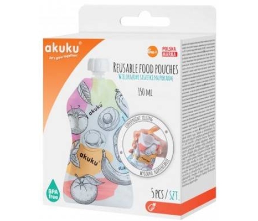 Jeśli szukasz alternatywy dla kupnych musików owocowych, to z pewnością przypadną Ci do gustu wielorazowe saszetki na pokarm marki Akuku! To ekologiczne rozwiązanie do przekąsek dla malucha, dzięki któremu ograniczysz ilość śmieci. Każdy woreczek ma pojemność 150ml.