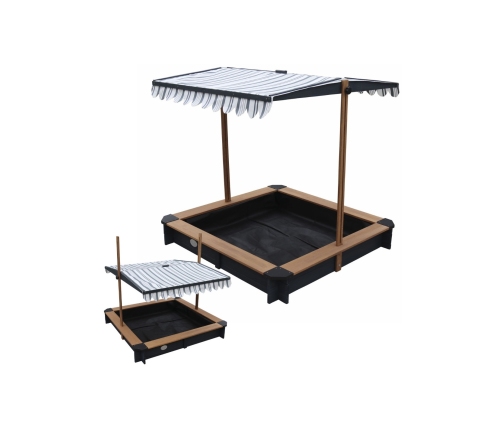 - Regulowany daszek 2w1 – wykonany z wodoodpornego poliestru (280 g/m²) z ochroną UV50, który chroni dzieci przed słońcem i deszczem. Można go łatwo regulować, dostosowując kąt nachylenia, a po zakończeniu zabawy – opuścić, zamieniając go w ochronną pokrywę piaskownicy.
