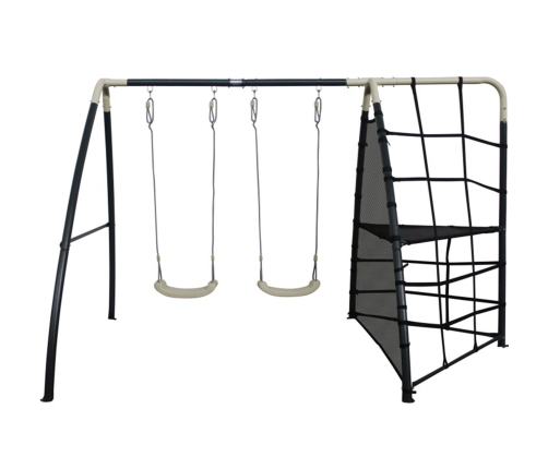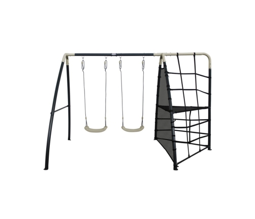 Ta podwójna huśtawka firmy Axi zawiera dwie huśtawki i siatkę do wspinaczki. Przeznaczony jest dla dzieci od 3 roku życia, a jego wymiary pozwalają na łatwy montaż w ogrodzie. Produkt ma 287 cm długości i 191 cm głębokości i tym samym zajmie powierzchnię 5,4 m². Ta metalowa bramka jest dostarczana jako zestaw i dlatego musi być zmontowana przez osobę dorosłą. W zestawie znajdują się kotwy niezbędne do prawidłowego zamocowania w gruncie. Konstrukcja tej huśtawki dla dzieci, wykonana jest z ocynkowanej stali, która jest wyjątkowo solidna i niewrażliwa na rdzę, która może ją uszkodzić. Nie ma konieczności konserwacji lub obróbki metalu. Siedziska do huśtawek są wykonane z polipropylenu, wytrzymałego i łatwego w czyszczeniu tworzywa sztucznego. Każda huśtawka może utrzymać maksymalny ciężar 50 kg, a jej wysokość można łatwo dostosować do wzrostu dziecka.