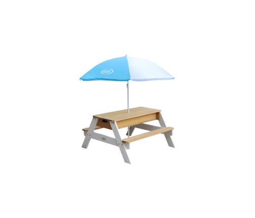 Stół piknikowy Nick od renomowanej marki AXI to wielofunkcyjny stół, który ma tajne pomieszczenie z dwoma niebieskimi pojemnikami pod zdejmowanym blatem. Te niebieskie pojemniki można wypełnić piaskiem i/lub wodą, ale oczywiście można w nich przechowywać również zabawki. Dodatkowo pojemniki są wyjmowane, dzięki czemu można je łatwo wyczyścić. Klasyczne połączenie piasku i wody zawsze sprawdza się u dzieci! W mgnieniu oka zamienisz stół z piaskiem i wodą w stół piknikowy, na którym dzieci będą mogły tworzyć, rysować lub cieszyć się smakołykami.
