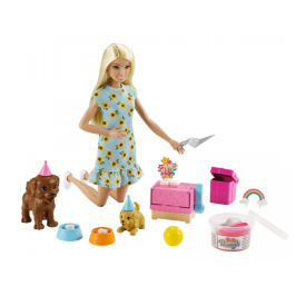 Barbija rīko ballīti saviem kucēniem, un jaunie prāti ir aicināti pievienoties jautrībai! Uzlieciet katram kucēnam svinīgo ballīšu cepuri, tad palīdziet Barbie® lellei piepildīt kūkas formu ar vienu vai abām komplektā iekļautās mīklas krāsām. Nospiediet sviru, lai noskatītos, kā tā "ceļas", un atklājiet glītu kaulu formas kūku!