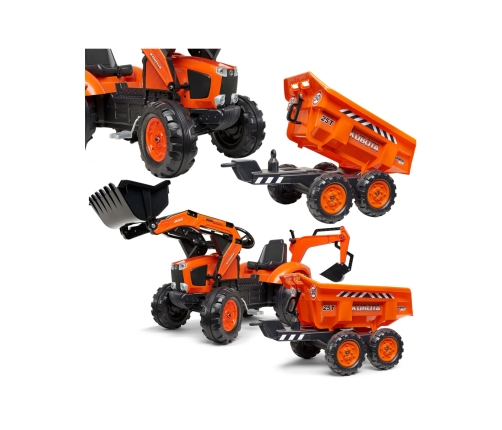 FALK Traktors KUBOTA ar piekabi ir īsta sapņu piepildījums ne vienam mazajam traktora vadītājam. Rūpīgi izgatavots, pievēršot uzmanību katrai detaļai! Neviens īsts lauksaimnieks šādu nenovērtēs. Pēdējais Kubota traktors ar pedāļiem bērniem ar kausiem, iekrāvēju un piekabi ir izgatavots no augstas kvalitātes plastmasas. Tam ir pagriežams sēdeklis. Transportlīdzeklis ir paredzēts bērniem no 3 gadiem. Katrs jaunais traktors to mīlēs. Transportlīdzeklis ir izgatavots oriģinālās uzņēmuma krāsās. FALK produkti ir augsta kvalitāte, rūpība par detaļām un izturīga konstrukcija!