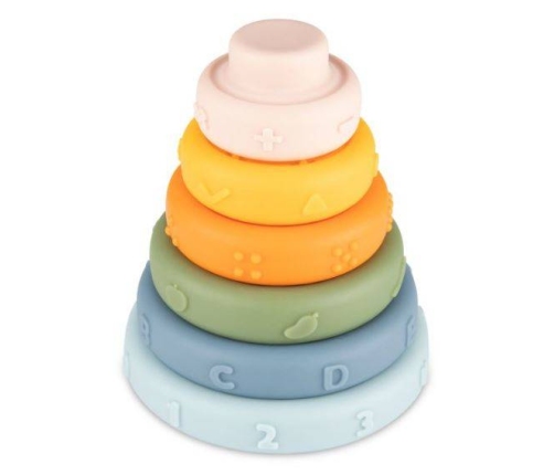 Sensoryczna zabawka układanka Canpol babies piramidka składa się z 6 elementów o różnych wielkościach i kolorach. Układanie kolorowych elementów jeden na drugim od największego do najmniejszego w kształt piramidy ćwiczy zręczność i cierpliwość dziecka. Sensoryczna układanka Canpol babies piramidka pomaga w nauce rozróżniania kolorów i wielkości, wspiera koordynację oko-ręka u dziecka. Każda warstwa piramidy ma wypustki o różnych kształtach – cyfry, literki, kropki itp., dzięki czemu Maluszek może dotykać je paluszkami poznając nowe faktury aktywizując zmysł dotyku lub „smakować” – poszczególne elementy świetnie sprawdzą się jako gryzaki. Sensoryczna układanka Canpol babies piramidka to klasyczna zabawka edukacyjna, dzięki której dziecko poprzez zabawę ćwiczy zdolności manualne, pamięć oraz wyobraźnię, a także logiczne i strategiczne myślenie – jak z porozrzucanych elementów ułożyć wieżę. Układanie sensorycznej piramidki to wspaniała wciągająca zabawa dla Maluszków. Sensoryczna układanka Canpol babies piramidka jest rekomendowana dla dzieci od 6 miesiąca życia.