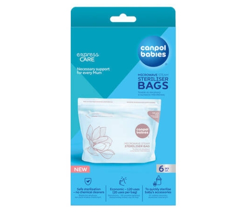 Woreczki do sterylizacji w kuchence mikrofalowej Canpol babies to prosty, szybki i bezpieczny sposób sterylizacji butelek, smoczków, laktatorów oraz innych produktów dla niemowląt i dzieci. Sterylizacja jest bezpieczna, bez użycia środków chemicznych i trwa jedynie 90 sekund. Para wodna, która się wytwarza w torebce podczas procesu sterylizacji, eliminuje bakterie i zarazki, zapewniając produktom higieniczną czystość. Każdą torebkę można użyć aż 20 razy, dzięki czemu jedno opakowanie wystarczy na 120 procesów sterylizacji. Jest to produkt zastępujący tradycyjny sterylizator, gdy jesteś w podróży i nie możesz zabrać ze sobą urządzenia lub nie masz wystarczająco miejsca w domu na dodatkowy sprzęt. Zostały wykonane z bezpiecznego tworzywa, nie zawierającego BPA ani innych szkodliwych substancji.