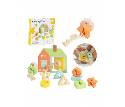 - - zestaw składa się ze sznureczka z kluczem, 11 klocków przedstawiających różne kształty oraz drewnianego domku,