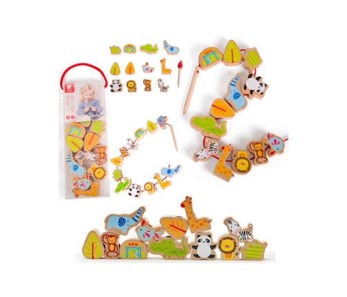 Drewniana sznurowanka ZOO marki Classic World to świetna zabawka dla dzieci, która pozwoli maluchom na rozwinięcie swojej zręczności, precyzji oraz koordynacji wzrokowo-ruchowej, pozwala poznać różne gatunki zwierząt zamieszkujących ZOO. Drewniane klocki do nawlekania na sznureczek posiadają kształty i motywy związane ze zwierzątkami z ZOO. Zadaniem dziecka jest nawlekanie koralików o różnych kształtach na sznureczek. Zabawka składa się z 12 klocków przedstawiających pandę, lwa, żyrafę, krokodyla, oraz inne elementy scenerii ZOO. Zabawka uczy również cierpliwości, oraz determinacji, gdyż nawleczenie wszystkich elementów na pewno pochłonie malucha bez reszty na wiele godzin.