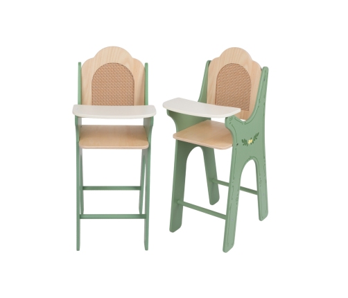 To eleganckie, wysokie krzesełko dla lalek to doskonały dodatek do zabawy w opiekę. Utrzymane w zielonej tonacji z subtelnymi kwiatowymi zdobieniami, nawiązuje do klasycznego stylu Vintage. Naturalny rattanowy splot w oparciu nadaje mu wyjątkowego uroku i autentycznego wyglądu. Idealnie sprawdzi się w zabawach tematycznych, rozwijając empatię i wyobraźnię dziecka.