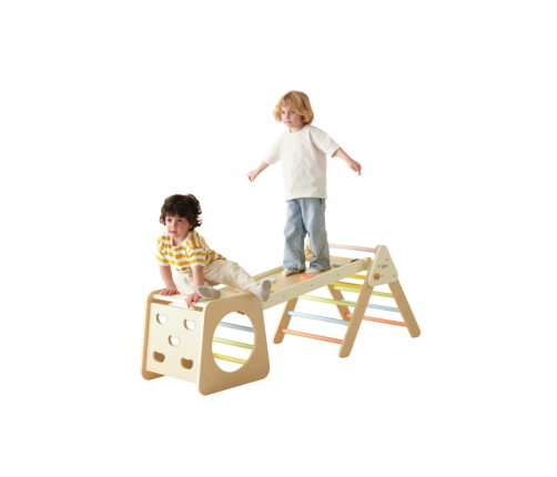 Drewniany zestaw wspinaczkowy trójkąt Montessori 5-w-1 od Classic World to wyjątkowa propozycja dla dzieci, które uwielbiają aktywną zabawę, ruch i rozwijanie swoich zdolności fizycznych! Ten pięknie zaprojektowany zestaw to nie tylko zabawka, ale także narzędzie wspierające rozwój motoryki, równowagi i koordynacji. Wykonany z solidnych, gładko wykończonych elementów drewnianych, stanowi bezpieczną przestrzeń do wspinania się, zjeżdżania i odkrywania własnych możliwości ruchowych. Zestaw może służyć zarówno jako plac zabaw jak i siłownia, pełni aż 5 funkcji aktywności w jednym produkcie! Może pełnić rolę drabinki, zjeżdżalni, mostka, tunelu i toru przeszkód. Dzięki składanej konstrukcji i lekkiej formie można go łatwo przenosić i dopasowywać do dostępnej przestrzeni – zarówno w domu, jak i w przedszkolu czy sali zabaw. Jego uniwersalny, naturalny wygląd z pastelowymi akcentami sprawia, że doskonale komponuje się z każdym wnętrzem, zachęcając maluchy do codziennej aktywności i ruchu poprzez zabawę.