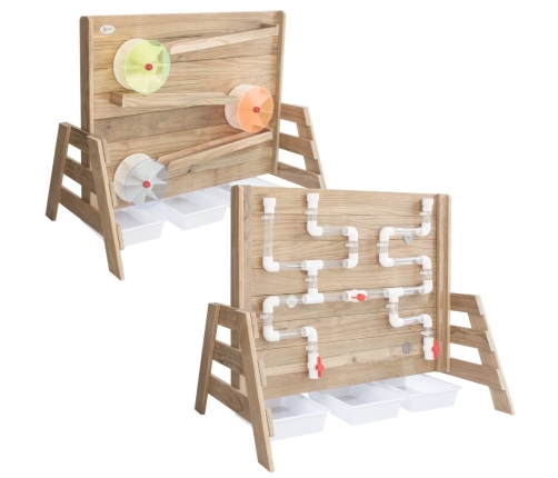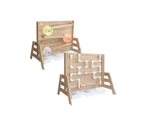 Drewniana Ściana "Zabawa Wodą" od renomowanej marki Classic World to idealne dopełnienie twojego placu zabaw. Produkt jest wyprodukowany z wysokiej jakości drewna, pomalowany nie toksycznym impregnatem, w pełni bezpiecznym dla dzieci. Należy nasypać piasek na drewnianą półkę i obserwować jak obsypuje się w dół, co będzie powodować obracanie się młynku. Z drugiej strony ścianki znajdują się tunele, do których można wlać wodę. Zabawa będzie pełnić funkcję nauki napędzania i wprowadzenia koła w ruch.