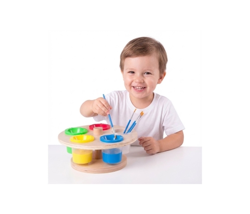 Rotējošais krāsu statīvs no CLASSIC WORLD ir kvalitatīvs, koka izstrādājums. Tam ir 5 plastmasas krūzītes ar vāciņiem, kas ir piemērotas bērniem — statīvam nav asu malu un tas ir stabils. Pateicoties aizveramajām tvertnēm, krāsas ir pasargātas no izžūšanas. Rotējošais krāsu statīvs lieliski noderēs arī bērnudārzos un citās izglītības iestādēs, jo ar to bērni novērsīs krāsu izsistīšanu, netīrot sevi un apkārtni. Tas ir arī lieliska ideja mājas lietošanai, ja jūsu mazais mākslinieks – tagad krāsos tikai papīru!