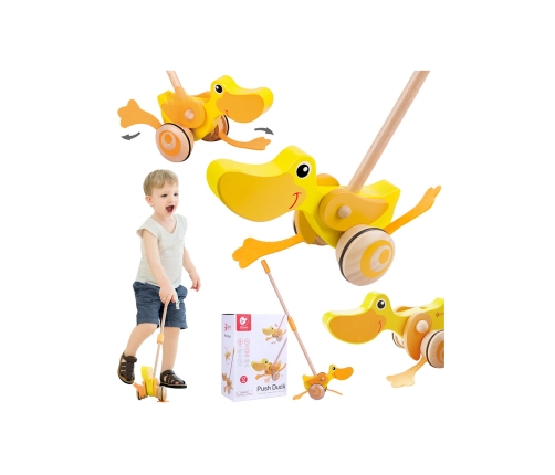Drewniana zabawka do pchania marki Classic World. Dzieci mogą ćwiczyć chodzenie, prowadząc przed sobą ulubioną zabawkę. Podczas jeżdżenia, kaczuszka klapie płetwami, powodując u maluszka śmiech i radość. Kaczuszka to bestsellerowa zabawka marki Classic World.