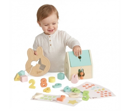 Powitalny BOX do nauki od marki CLASSIC WORLD to uroczy zestaw upominkowy dla dla dzieci w wieku od 12 do 18 miesięcy, który wykorzystuje ich niepohamowaną ciekawość świata. Zestaw zawiera sorter, układanki do nauki liczenia ze wzorami, klocki oraz zabawkę do przewlekania w kształcie królika. Dzieci mogą rozwijać eksplorację wzrokową i umiejętności motoryczne. Zestaw buduje i kieruje ich zdolnościami w sposób zrównoważony.
