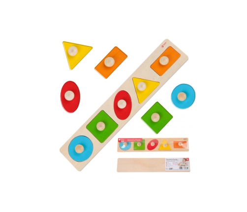 - - Zestaw zawiera: tablicę z wgłębieniami i 6 elementów przedstawiających figury geometryczne z pinezkami do chwytania.