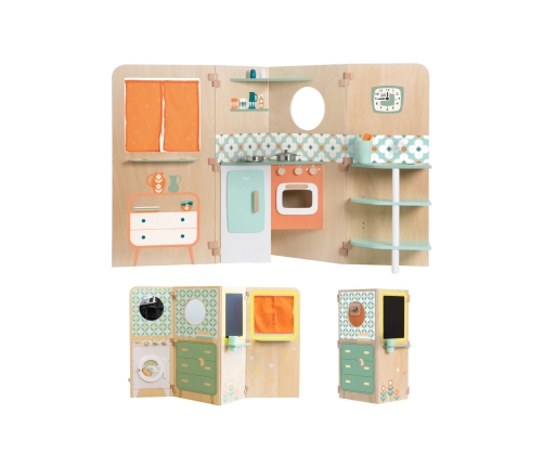 Wielofunkcyjny składany domek od marki CLASSIC WORLD daje nieograniczone możliwości zabawy. Odsłania różne przestrzenie do zabawy, takie jak kuchnia, a także pralnia z pralką, tablica magnetyczna i okno. Może być również wykorzystywany jako teatr kukiełkowy. Dzieci mogą bawić się „na zewnątrz” i „wewnątrz”, patrząc przez okno. Składany domek jest bardzo kompaktowy a dzięki dobremu systemowi otwierania i składania, nie zajmuje dużo miejsca.