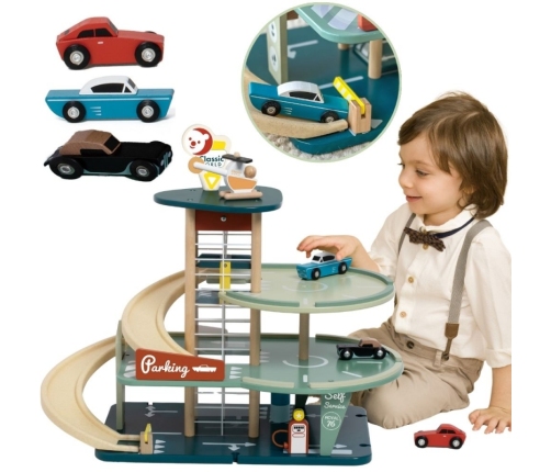 Zainspirowany latami 50-tymi, ten garaż od marki CLASSIC WORLD przypomina złotą erę samochodów! Zabawka oferuje stylowe samochody, myjnię samochodową, dystrybutor paliwa i rampy bioplastowe umożliwiające dojazd na parking. Winda obsługuje wszystkie 3 poziomy i jest zwieńczona platformą, na której znajduje się helikopter. Podstawa wyposażona jest w przyłącza umożliwiające utworzenie toru. Zabawka rozwija umiejętności motoryczne oraz językowe. Zabawa z innymi dziećmi pomaga również w rozwijaniu umiejętności społecznych. Drewno posiada certyfikat FSC, a rampy wykonane są z bioplastiku.