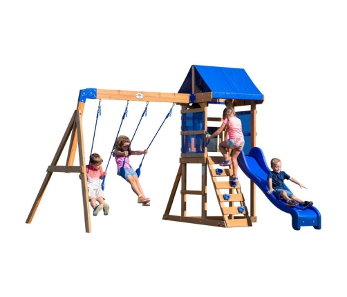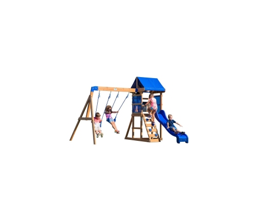 Plac zabaw Aurora Backyard Discovery to doskonała propozycja również dla mniejszych ogrodów. Zabawa w ogrodzie już nigdy nie będzie nudna! Drewniany plac zabaw Aurora oferuje wiele możliwości zabawy. Znajdziemy tu platformę z pofalowaną niebieską zjeżdżalnią, na którą dostać się można dzięki bezpiecznej drabince, która pełni również rolę ściany wspinaczkowej. Całość przykrywa niebieski daszek, który zapewni dziecku schronienie przed słońcem. W dolnej części znajdziemy piaskownicę, oraz dwie solidne huśtawki.