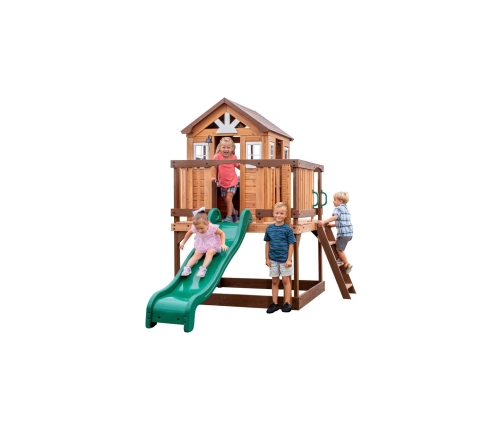 Plac Zabaw Echo Heights firmy Backyard Discovery to godziny wspaniałej zabawy na swoim własnym podwórku. Dzięki kompaktowej konstrukcji ten domek do zabawy idealni sprawdzi się w każdym ogrodzie. Małe dzieci będą zachwycone funkcjami do zabawy, takimi jak kuchenka, urządzenie na baterie, superszybka zjeżdżalnia i wszystkie inne akcesoria. Funkcjonalne podwójne drzwi i duże otwarte okna sprawiają, że Twoje dziecko może widzieć wszystko dookoła podczas zabawy. Drabinka wejściowa z szerokimi stopniami umożliwia łatwy dostęp dzieciom w różnym wieku. Skorzystaj z dołączonej miarki wzrostu, aby śledzić wzrost dziecka i wspólnie tworzyć wspomnienia. Kiedy Twoje dziecko skończy zabawę w domku, może błyskawicznie zjechać ze zjeżdżalni.