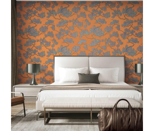 Šai izturīgajai neausto tapešu loksnei ir skaists priedes dizains zilā un oranžā krāsā. Tās var noņemt pavisam sausas, nesabojājot sienu.