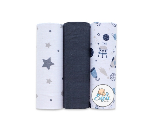 Komplet przewiewnych pieluszek muślinowych. W skład kompletu wchodzą 3 pieluszki muślinowe- dwie we wzorki i jedna kolorowa. Muślin charakteryzuje się lekkością i wyjątkową miękkością, której nabiera z każdym praniem, a dzięki tym właściwościom idealnie sprawdza się już od pierwszych dni życia. Zestaw zapakowany jest w transparentną torbę zapinaną na zamek.
