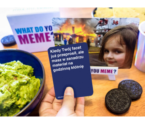 "What Do You Meme?" w polskiej wersji językowej to idealna gra na imprezę. Przy odpowiednio pozytywnym nastawieniu wszystkich uczestników i odrobinie kreatywności grających, szybko stanie się centralnym punktem każdej domówki, wywołując salwy szczerego śmiechu. Jak się gra w tę grę? Mechanizm jest śmiesznie prosty. W każdej rundzie wyznaczany jest jeden sędzia. Wybiera on kartę z obrazkiem, do którego reszta graczy będzie miała za zadanie dobrać kartę z jak najśmieszniejszym opisem. Sędzia przy wsparciu graczy wybiera wygraną kombinację i wręcza kartę osobie, która ją dopasowała. Następnie wyznacza się kolejnego sędziego na następną kolejkę i powtarza się schemat. Wygrywa osoba, która na końcu posiada najwięcej kart.