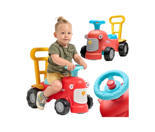 Maurice ir jauks traktors no franču zīmola Falk, kas būs kopā ar jūsu bērnu viņa pirmajās gaitās. Spilgti krāsu toņi un noapaļotas formas iepriecinās katru mazuli. Traktora iedarbināšana, izmantojot mazu skaņas pogu, kā arī skaņas signāls, kas atrodas uz stūres, ir lieliska pirmā mācība, kas stimulē jūsu bērna motoriskās prasmes un dzirdi. Braucot ar jeździk, spēlējoties ar stūri un griežamiem riteņiem, bērns attīstīs koordināciju un līdzsvaru. Stāvot aizmugurē, viņš var izmantot ergonomisko atzveltni, lai mācītos staigāt, spēlējoties, bez bailēm un pilnīgā drošībā. Zem sēdekļa atrodas neliels nodalījums, kur var glabāt savus dārgumus.