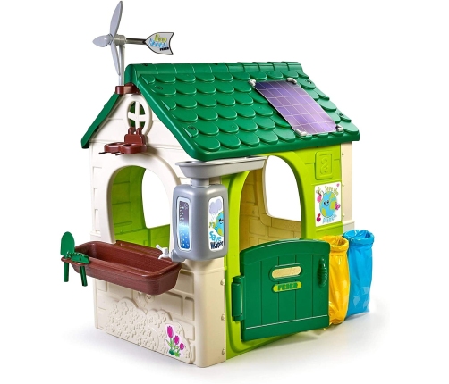 FEBER ECO dārza namiņš ir spēļu namiņš, kurā ir visas aktivitātes, kas nepieciešamas mazajiem, lai attīstītu interesi par dabu. Tas ir lielisks vieta un izcila mācīšanās bērniem! Komplektā ir 2 atkritumu šķirošanas grozi (dzeltenais un zilais), mazs dārziņš (puķu podos) un dārza rīki. Tas ir lielisks veids, kā bērniem izbaudīt aktivitātes brīvā dabā. Var spēlēties, stādot sēklas un novērojot augu augšanu. Namiņš ir aprīkots arī ar putnu būrīti un barotavu. Lietus ūdens ir ideāls augu vai puķu laistīšanai. Ventilators un saules paneļa imitācija piedāvā fantastiskas iespējas mācīties par ilgtspējīgu enerģiju! Namiņš ir izturīgs, viegli montējams un aprīkots ar ANTI-UV sistēmu, kas novērš krāsas izbalēšanu un palielina materiāla izturību.