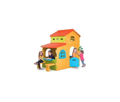 Domekā ir arī galds un divas soliņi, kur bērni var ēst vai atpūsties. Tas viss ir izgatavots no krāsaina materiāla, kas ir izturīgs pret saules starojumu un temperatūras svārstībām. Super Villa no Feber ir ļoti viegli montējama, tādējādi ātri radot prieku jūsu bērniem!
