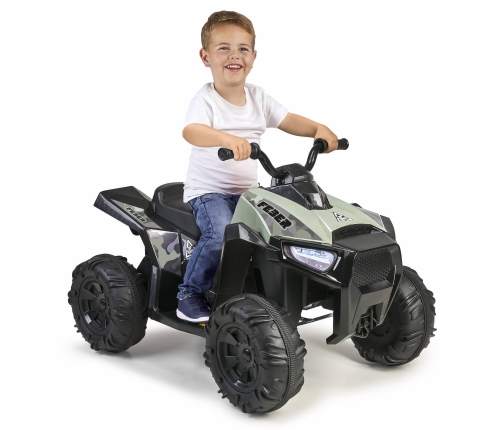 Niesamowity pojazd elektryczny od renomowanej, hiszpańskiej marki Feber. Barwa moro nadaje terenowego wyglądu. Quad został wyposażony w duże i wytrzymałe koła, które zapewnią lepszą przyczepność, oraz przy użytkowaniu w domu są ciche i nie niszczą podłóg. Wyposażony został w akumulator o mocy 12V, bieg do przodu i do tyłu, oraz hamulec nożny.