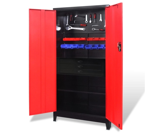 Instrumentu skapis ir izgatavots no tērauda, kuram ir īpaši stiprs pārklājums, kas būs izturīgs pret skrāpējumiem. Pateicoties 3 punktu aizslēgšanas sistēmai ar 2 atbilstošām atslēgām, jūsu instrumenti un citas mantas būs drošībā. Šim instrumentu skapim ir 2 iebūvēti plaukti, kas paredzēti uzglabāšanas tvertnēm (tvertnes nav iekļautas sūtījumā), un 3 noņemami plaukti. Katra plaukta maksimālā slogojamības kapacitāte ir 40 kg. Tam ir arī panelis, kas noderēs dažāda veida instrumentu, piemēram, uzgriežņu atslēgu, knaibļu, āmuru un citu instrumentu pakāršanai (instrumenti un paneļa āķi nav iekļauti sūtījumā).