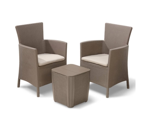 Krēsliem ir ērti roku balsti un ergonomiski veidota atzveltne lieliskam sēdēšanas komfortam. Pieskaņotie matrači ir iekļauti komplektā. Galdam ir rotangpalmas imitācijas sāni un līstīšu dizaina galda virsma, zem kuras atrodas uzglabāšanas nodalījums. Šis ērtais dārza mēbeļu komplekts ir izgatavots no izturīgas un pret laikapstākļiem noturīgas plastmasas, kam nav nepieciešama īpaša kopšana. Tas kalpos daudzus gadus, nenolietojoties un nerūsējot.