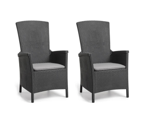 Mūsdienīgais dārza krēsls lieliski piestāvēs jebkurām mēbelēm vai āra galdam. Tā kā krēslam ir nolaižama atzveltne, jūs vienmēr varēsiet noregulēt to sev ērtākajā pozīcijā. Pateicoties ūdensdrošajam un pret dažādiem laikapstākļiem noturīgajam materiālam ar rotangpalmas pinuma rakstu, šo atpūtas krēslu ir viegli tīrīt un tas jums kalpos ilgu laiku. Krēslam ir spēcīgs rāmis, bet tā konstrukcija ir ļoti viegla, kas ļaus to viegli pārvietot. Komplektā ir iekļauti noņemami sēdekļa spilveni, kas ir ne tikai ērti, bet arī viegli mazgājami. Komplektā ir iekļauti 2 dārza krēsli un 2 spilveni.