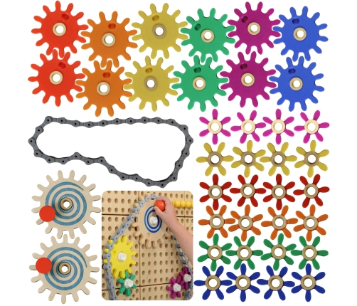 Zestaw kolorowych trybików i kół zębatych, które pozwalają na skonstruowanie skomplikowanych mechanizmów. Zabawkę montuje się na Tablicy Naukowo-Kreatywnej Masterkidz STEM przy pomocy specjalnych śrub Masterkidz. Zabawa kołami zębatymi poprawia motorykę dziecka, zdolność logicznego myślenia, a także kreatywność.