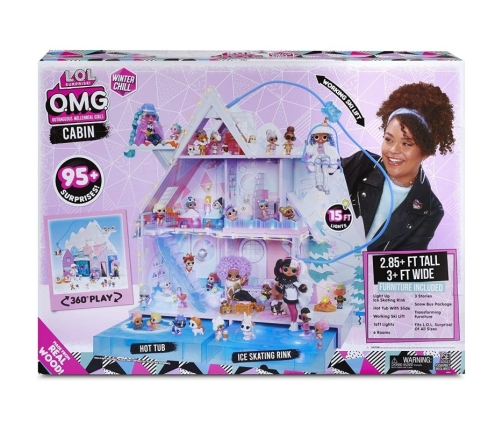 L.O.L. Surprise! O.M.G. ziemas atpūtas namiņš ir brīnišķīga vieta, kur pavadīt ziemas brīvdienas. Lec iekšā Sniega autobusā un atver vairāk nekā 95 pārsteigumus. No koka izgatavotajā 3 stāvu mājiņā ir 6 istabas un tā ietver apgaismojamu slidotavu, funkcionējošu slēpošanas pacēlāju, karstu vannu un daudz ko citu. Tā ir piemērota gan L.O.L. Surprise! O.M.G. modes lellēm, gan L.O.L. Surprise! lellēm! Izmantojiet komplektā iekļauto 4,5 m garo lampiņu virteni, lai izrotātu un izgaismotu mājiņu. Sasaldē ūdeni uz īstas slidotavas, lai L.O.L. Surprise! O.M.G. modes lelles un L.O.L. Surprise! Lelles varētu izslidoties. Pēc tam viņas pa slidkalniņu var ieslīdēt karstā vannā, lai mazliet atslābinātos. Viņas var izbraukt ar īstu slēpošanas pacēlāju, kas stiepjas no 1. stāva līdz pat 3. stāvam. 1. stāvs ir teicami piemērots, lai lelles varētu atpūsties pie kamīna vai padejotu zem disko bumbas. 2. stāvā atrodas guļamistaba un vannas istaba. Guļamistabā ir gultas, ko var pārveidot par divstāvu gultām, bet vannas istabā ir B.B. sauna un tualete, kas rada ūdens aizskalošanas skaņas. 3. stāvā atrodas kafejnīca un pasakaina sauļošanās terase, kur lelles var baudīt kalnu ainavas. Izmantojiet 360º rotaļāšanos, jo L.O.L. Pārsteigums! mājiņas aizmugurē atrodas ciemata fons, radot papildu vietu rotaļām.
