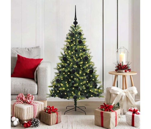 - Iepriekš uzstādītās LED gaismas: Siltās baltās LED lentes rada mājīgu atmosfēru bez papildu rotājumiem. Gaismas ir izvietotas tā, lai tās apgaismotu katru zaru no augšas līdz apakšai, izceļot tavas dekorācijas un padarot tās mirdzošas.