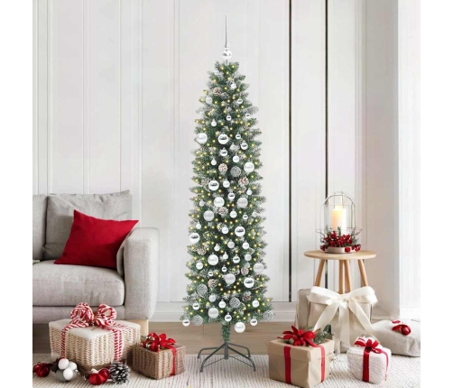 Mūsu mākslīgais tievais Ziemassvētku koks piedāvā modernu stilu ar dzīvotspējīgu izskatu, kas ir lielisks papildinājums jūsu svētku dekorācijām. Tā tievā konusveida forma viegli iederas jebkurā dzīvojamās istabas vidē, kas padara to par ideālu risinājumu mazām telpām. Ar PVC un metāla struktūru šis koks lieliski imitē tradicionālo priežu dabisko skaistumu un ir pietiekami izturīgs, lai izturētu visus svētkus. Izbaudiet siltu LED gaismu, kas piešķir mājīgu atmosfēru ģimenes sanāksmēm, svinībām un pēcpusdienām mājās.
