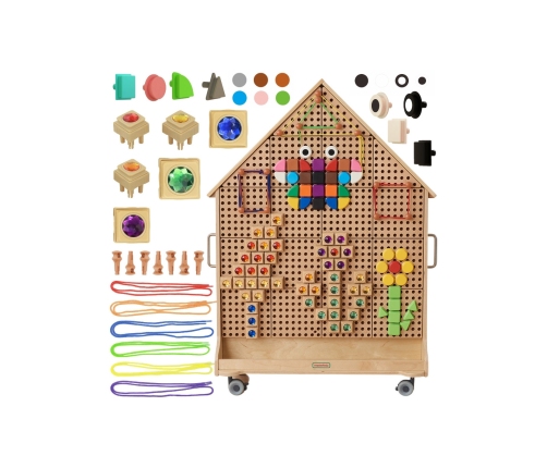 Wolnostojąca Tablica STEM w kształcie domku to doskonały wstęp do świata STEM. Wspaniały panel edukacyjno-naukowy, który za pomocą kółek w łatwy sposób można przemieszczać. Dzięki tej Tablicy maluch poznaje świat mechanizmów, fizyki, matematyki oraz wielu innych ciekawych rzeczy. Dedykowane kołeczki, a także kolorowe elementy umożliwiają Twojemu dziecku na stworzenie niepowtarzalnych konstrukcji oraz wspaniałych wzorów.