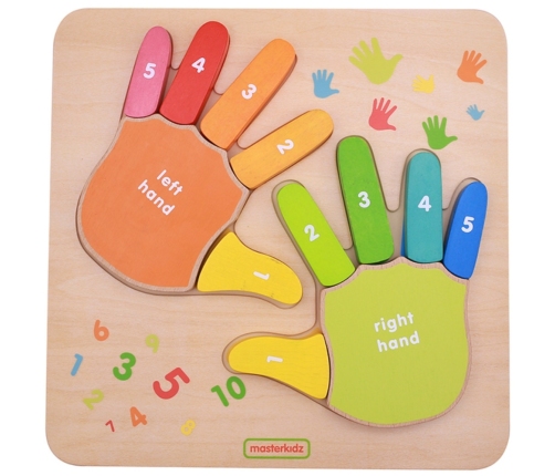 Drewniana tabliczka do nauki liczenia na palcach marki MASTERKIDZ to świetna pomoc dla maluszków, które zaczynają swoją matematyczną przygodę. Kolorowe dłonie na tabliczce są dokładnie opisane nazwami palców, oraz stronami: prawą i lewą. Każdy z palców ma również przypisaną cyferkę, dzięki czemu dziecko może zdobytą wiedzę przełożyć na liczenie na własnych palcach, gdy już zrozumie zasadę.