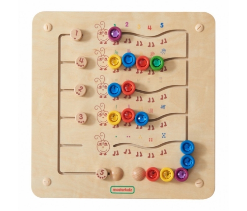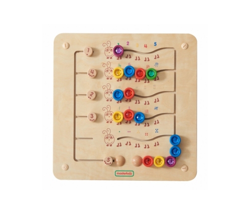 Tablica edukacyjna przedstawia 5 kolorowych gąsienic i zawiera 15 liczników z diamentami w 5 kolorach, umieszczonych na suwakach. Dzieci mogą je przesuwać, ale nie usunąć. Tablica pokazuje 5 zamienników liczb od 1 do 5 (cyfry, palce, linie, bloki, kropki). Po lewej stronie znajdują się suwaki umożliwiające ustawienie wyzwań. Dzieci mogą bawić się w sposób swobodny lub korzystać z tablicy do nauki liczenia w górę i w dół do 5, przesuwając klejnoty na odpowiednie miejsca.