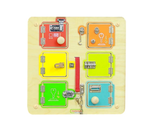 Otwieranie i zamykanie zamków to nie łatwe zadanie dla Twojego dziecka! Dlatego fantastyczna tablica ścienna marki Masterkidz jest gotowym rozwiązaniem do zdobywania tej umiejętności. Tablica składa się z drewnianej płyty oraz 6 mini-sejfów, na których można ćwiczyć. Niektóre z nich Twoje dziecko otworzy bez problemu, z kolei inne będą stanowić duże wyzwanie. Jest to jedna z zabawek, która nie pozwala odejść dziecku dopóki nie osiągnie celu.