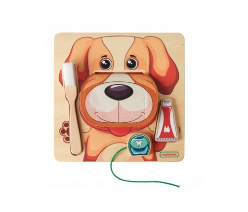 Ta edukacyjna tablica łączy zabawę w czyszczenie zębów psa z nauką o higienie jamy ustnej. Przedstawia przyjaznego psa z otwierającym się pyszczkiem, odsłaniającym 10 zębów. Zestaw zawiera zabawkową pastę, szczoteczkę i nitkę do zębów. Dzieci mogą bawić się w czyszczenie zębów psa, wyciskając pastę na szczoteczkę, szorując i nitkując zęby, co rozwija ich motorykę i precyzję. Zabawka zachęca do rozmów o dbaniu o własne zęby, a także umożliwia zabawę samodzielnie lub w parach.