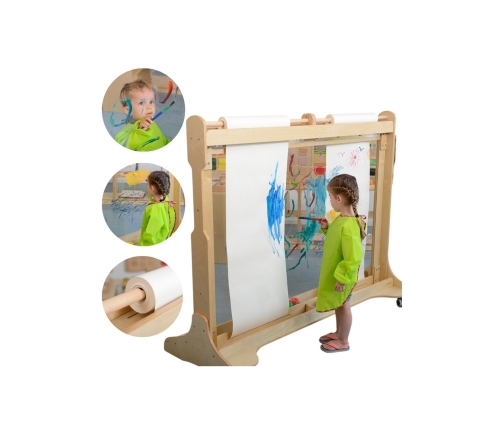 Okienko posiada możliwość zamocowania rolki z papierem, dzięki czemu dziecko może bawić się, malując na papierze, lub na szkle - wedle uznania. Okienko jest na tyle duże, że śmiało bawić może się jednocześnie nawet 4 dzieci.
