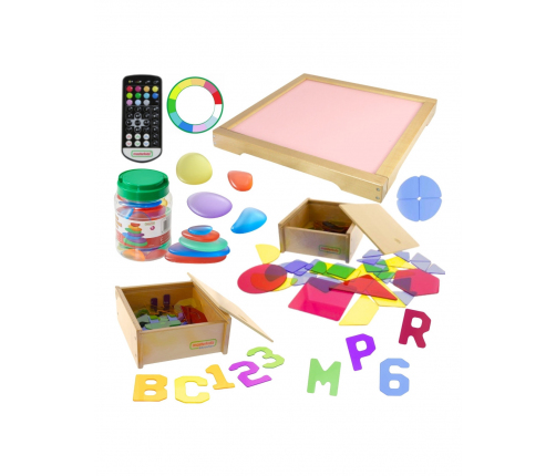 Panel Skrzynia LED Sensoryczna Masterkidz to solidna, drewniana skrzynka z podświetleniem LED emitującym kolorowe światło z możliwością dowolnej konfiguracji dzięki dołączonemu pilotowi, użytkownik może ustawić panel na jeden z 11 zaprogramowanych kolorów, lub ręcznie zmienić emitowany kolor bazując na podstawowych barwach światła: czerwonej, zielonej i niebieskiej. Urządzenie pozwala także na płynne przechodzenie pomiędzy kolorami oraz zapamiętywanie wybranych barw do ponownego użycia. Panel świetlny LED umożliwia różnorodne aktywności wspierające rozwój kreatywności, takie jak mieszanie kolorów czy nauka poprzez system STEM. Efektowne rezultaty uzyskuje się, gdy światło przenika przez różne materiały – liście, papier, tackę z piaskiem czy przezroczystą wodą. Panel doskonale współpracuje z dołączonymi do zestawu kolorowymi akcesoriami które wzbogacają możliwości zabawy i nauki, umożliwiając tworzenie różnorodnych wzorów i kompozycji w świetle.