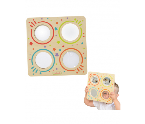 Fantastyczna zabawka sensoryczna firmy MASTERKIDZ, która nie tylko dostarcza mnóstwo rozrywki, lecz także uczy. Drewniana tabliczka wykorzystuje 3 rodzaje luster i soczewkę, by pokazać świat nieco inaczej, niż widzimy go gołym okiem. Dziecko może zobaczyć zakrzywiony obraz odbijany w lusterku wklęsłym, nieco inną jego wersję w lusterku wypukłym, oraz patrzeć na wszystko w przybliżeniu dzięki soczewce powiększającej. Ostatnie z luster to zwykłe lustro, w którym dziecko może się przeglądać, by wypracowywać samoświadomość i pewność siebie.