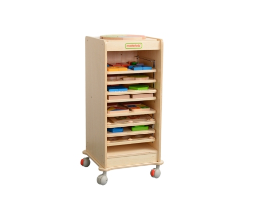 Drewniana szafeczka została zaprojektowana specjalnie w celu przechowywania ręcznych tabliczek Masterkidz. Mieści aż 10 sztuk o rozmiarach 28x28cm, więc jest to bardzo praktyczne rozwiązanie. Do szafeczki można dokupić kółka, dzięki którym przenoszenie szafeczki będzie dużo łatwiejsze, nawet gdy będzie pełna. Kółka można zablokować, by można było unieruchomić mebel, bez potrzeby demontowania kół.